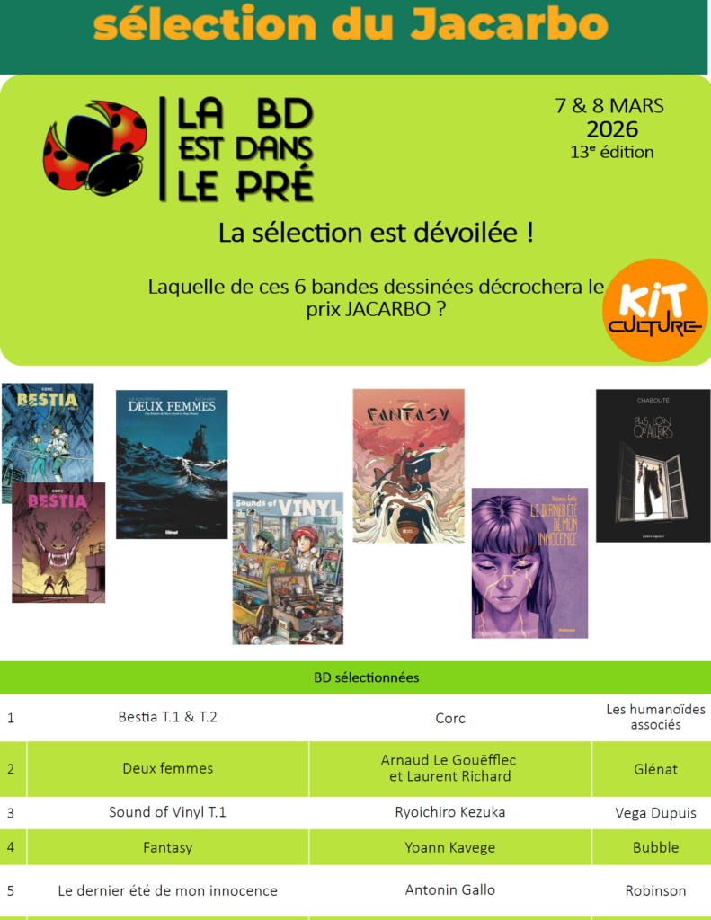 Le prix Jacarbo est décerné chaque année à un album à partir d’une sélection établie par un comité de lecture de KitCulture.